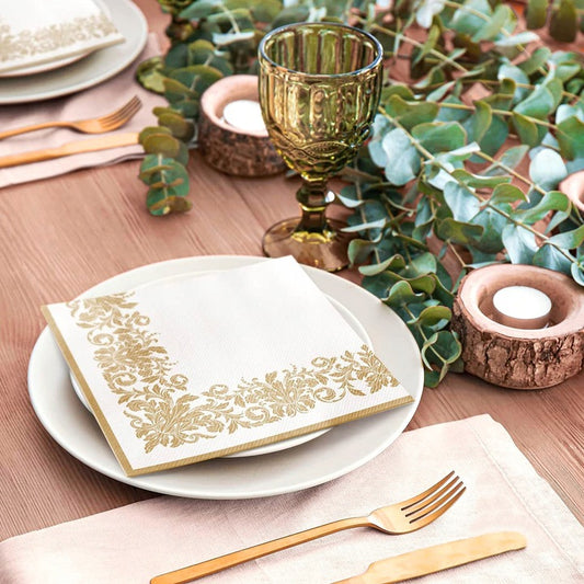 SERWETKI flizelinowe PAW 40x40 ROCOCO biało złote - 50 szt WESELE IMPREZA PRZYJĘCIE